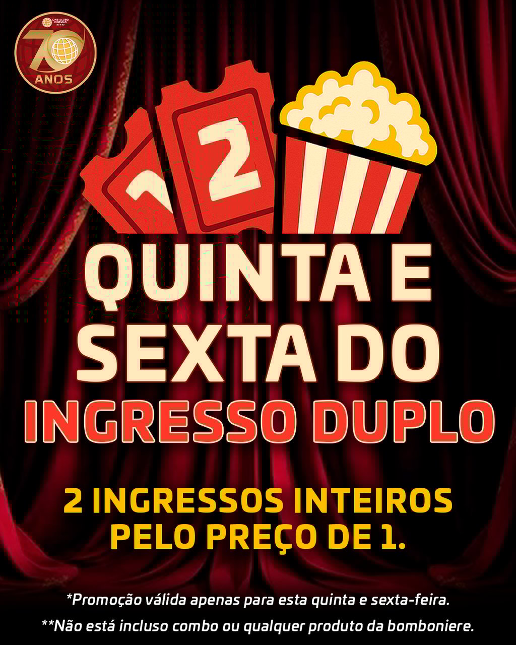 Promoção válida somente nas segundas, terças e quartas-feiras QUANDO FOR ANUNCIADO NAS REDES SOCIAIS, aonde TODOS pagam o valor do MEIO INGRESSO